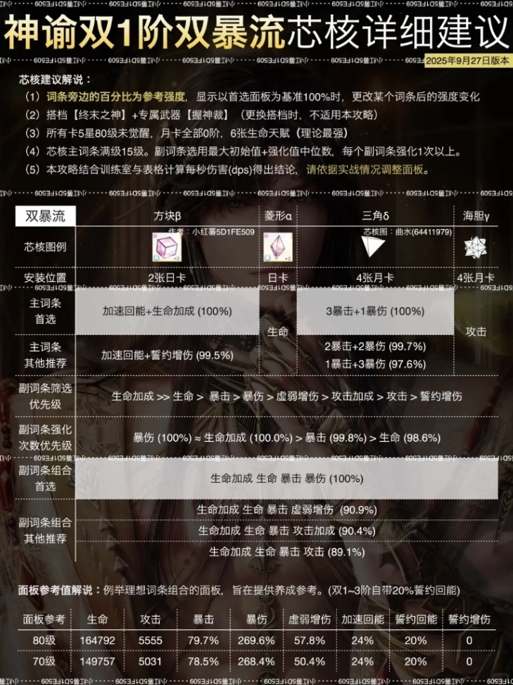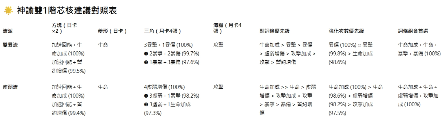 • 副詞條強化優先級:暴傷 (100%) ≈ 暴擊 (99.8%) > 生命加成 (98.6%)