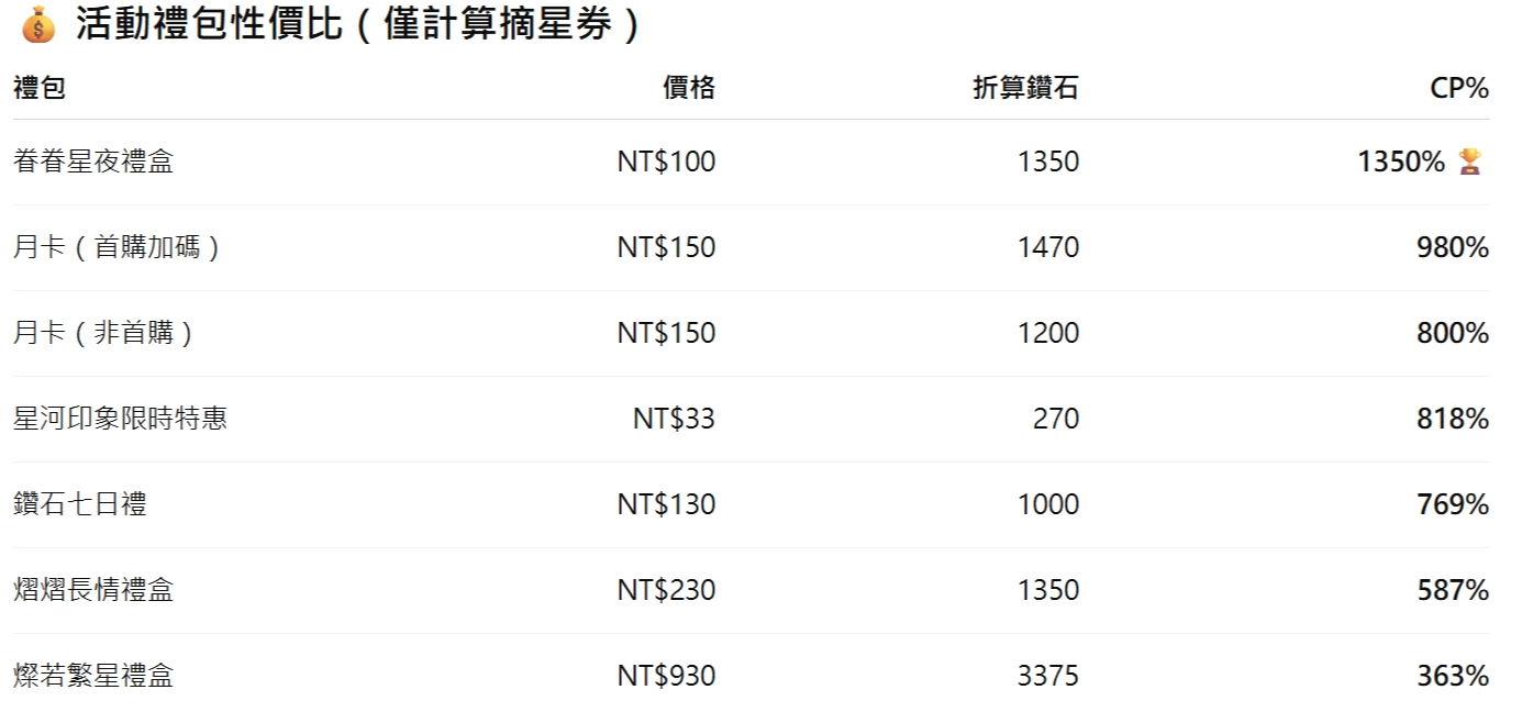 💰活動禮包性價比(僅計算摘星券)