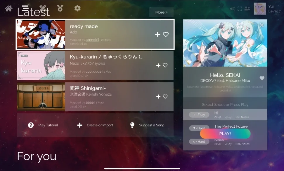 懶得下載或不想下載的你想玩音遊嗎?那推薦你玩這個「Rhythm Plus」,有非常多首歌,可以選擇喜歡的歌曲來遊玩,就是節奏遊戲的玩法~
