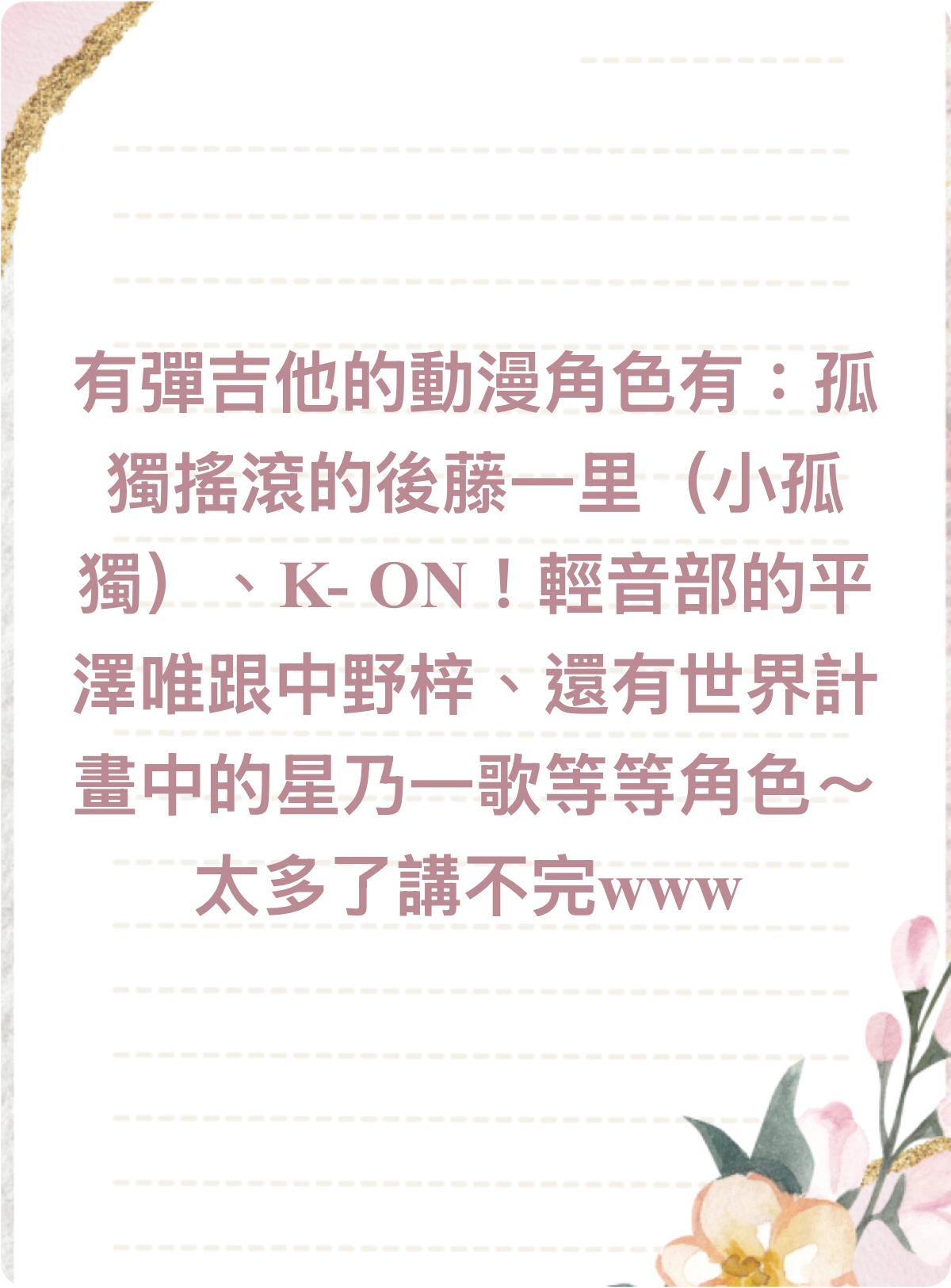 大家好~我要來分享一下我個人的一個小願望!我呢,很憧憬動漫或藝人中彈吉他的人,電吉他還是木吉他都一樣憧憬,感覺超帥的!而且我也很喜歡吉他的聲音,今天看到隔壁班有人帶吉他來心裡也是蠻憧憬的,沒錯!我很想學吉他,雖然我媽有給我烏克麗麗,但沒給我調音器我根本不會啊!!!而且我爸說我想學樂器的話,他有很大機率會說「先學好數學,數學是以後很多工作會用到的東西」,我本人的數學是很爛的那種,像這次期末考考了個52分(?),也完全對直笛一竅不通,不過我還是蠻希望可以學自己很憧憬的事物呢~但吉他很貴吧,我自己也不希望給父母的經濟狀況太大的負擔,或許未來會有機會吧?希望以後有機會可以學啦~